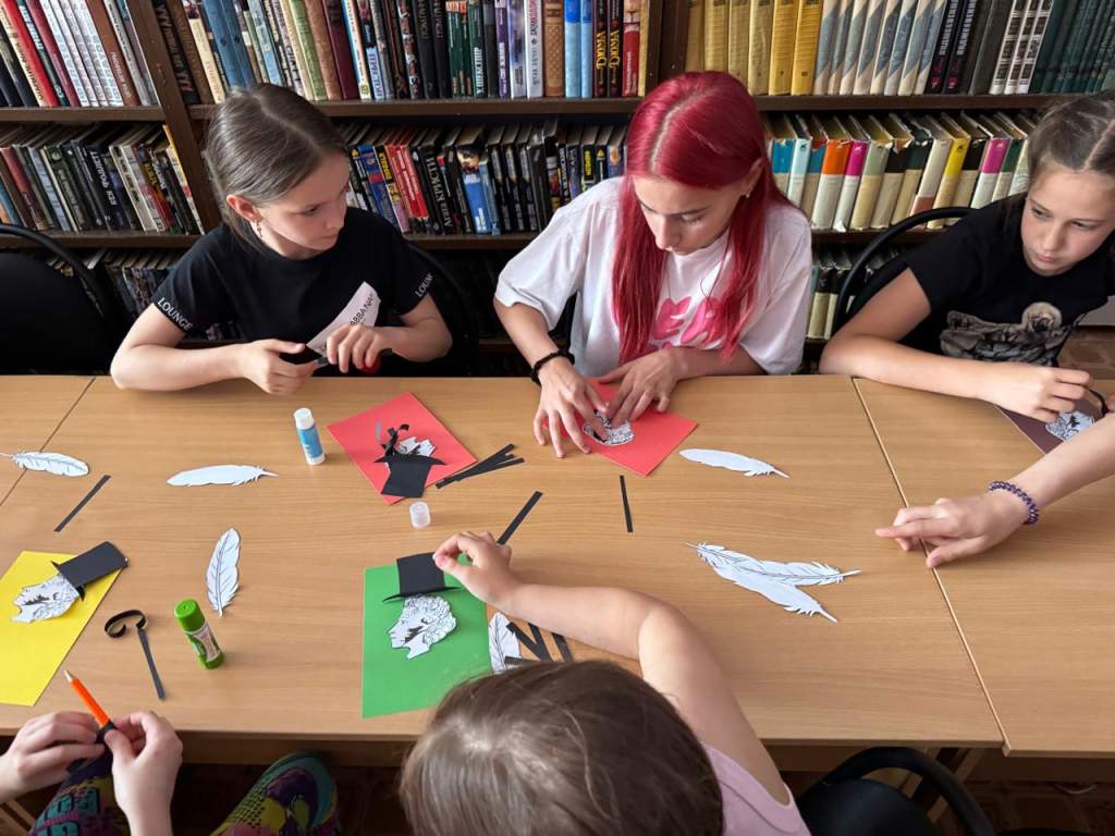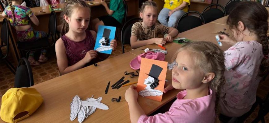Открытку на память о встрече гости выполняли сами. А вот заготовки им предоставили работники библиотеки: светлый профиль поэта, чёрный цилиндр и перо. Вырезанные из тёмной бумаги кудряшки, доставшиеся ему от прадеда-эфиопа, девочки приклеивали сосредоточенно и кропотливо. Надо всё выполнить аккуратно, момент ответственный, как ни как, работа над обликом самого Александра Пушкина.