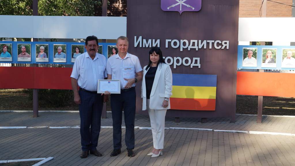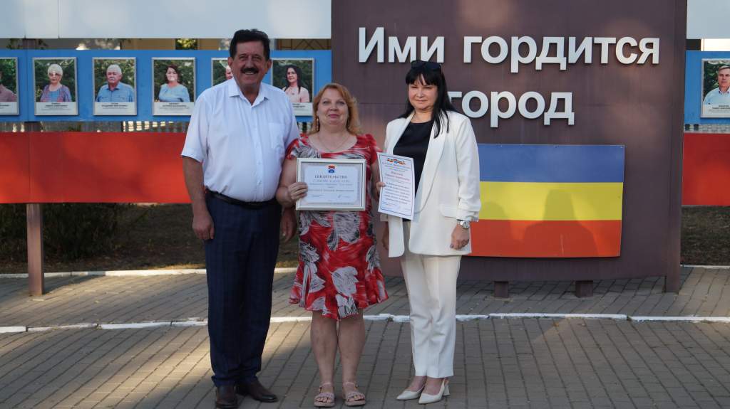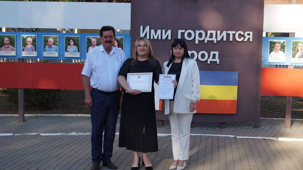 Председатель Донецкой городской Думы Александр Клименко и заместитель главы Администрации Донецка Ольга Грицай первыми поздравили самых достойных, а также вручили Свидетельство о занесении на Доску Почета Муниципального образования «Город Донецк» и Благодарственное письмо Донецкой городской Думы.