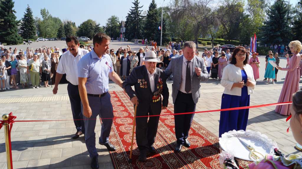Почетное право перерезать ленточку на открытии двлрца предоставили нашему уважаемому ветерану, а также депутату Государственной Думы РФ, главе Администрации Донецка и представителю хозяев здания – директору МБУК ГДК “Шахтер” Юлии Чернуха.