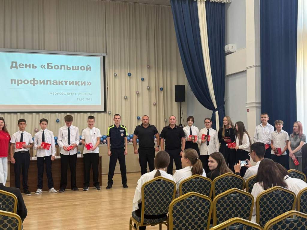 В школе № 18 прошла профилактическая встреча школьников и сотрудников полиции Донецка. Перед школьниками выступили: начальник отдела подполковник полиции Сергей Михайличенко, заместитель начальника по охране общественного порядка подполковник полиции Илья Клочков, инспектор ДПС ОГАИ Артем Коневский и специалист по организации работы местного отделения Общероссийского общественно-государственного движения детей и молодежи «Движение Первых» в городе Донецке Ольга Котрецкая.