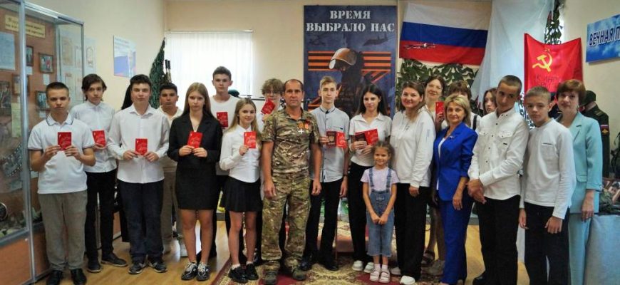 Учащиеся донецких школ получили свой главный документ из рук участника специальной военной операции Юрия Друка и руководителя местного отделения “