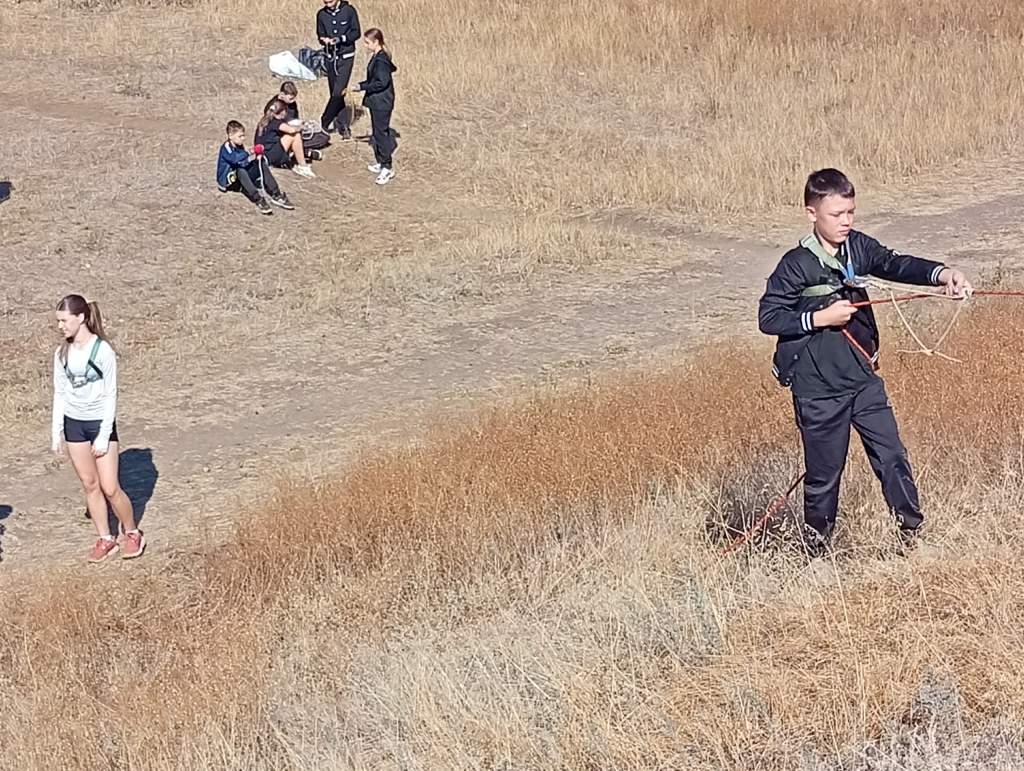 Школьные команды соревновались в командном прохождении трассы с туристическими препятствиями: вязка узлов, подъем на гору и спуск, параллельные перила, кочки и перенос пострадавшего.