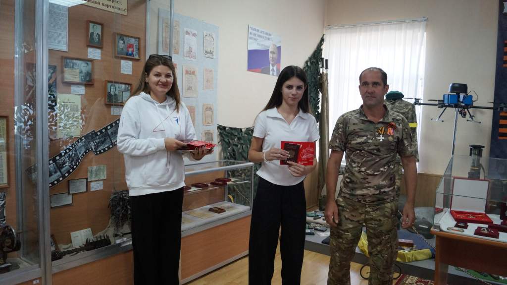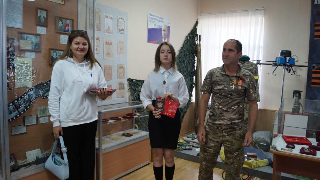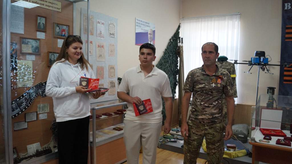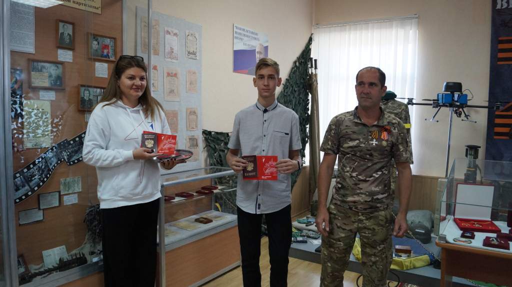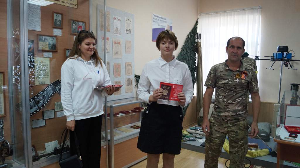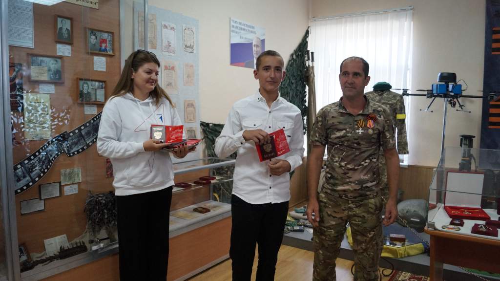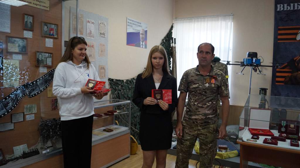 Учащиеся донецких школ получили свой главный документ из рук участника специальной военной операции Юрия Друка и руководителя местного отделения “Движения Первых” Ольги Котрецкой.