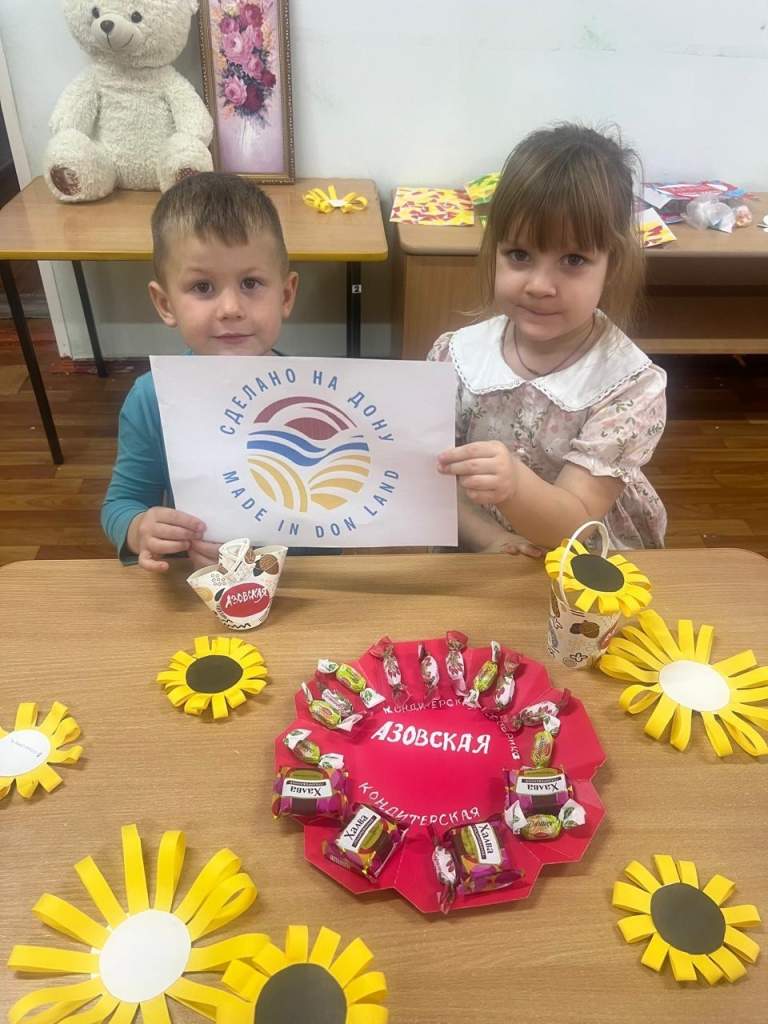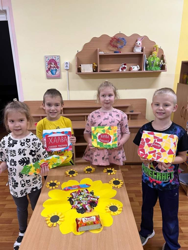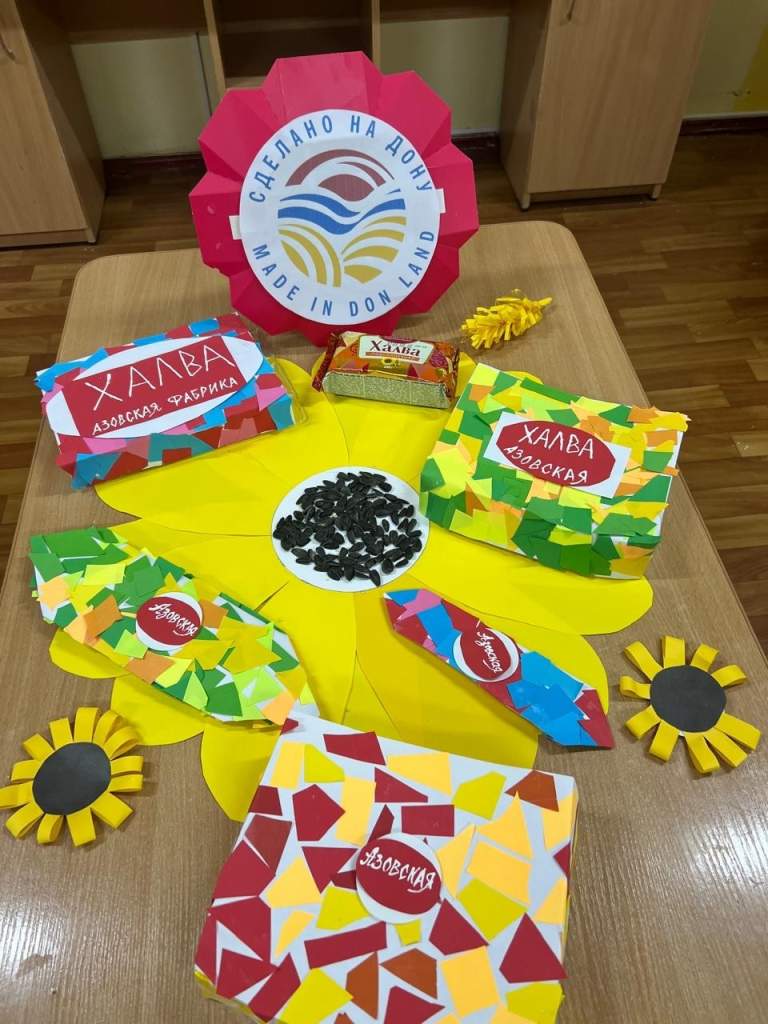 С большим интересом и увлечением для ребят педагог ,Разинькова Н.А. провела беседу “Выращено на Дону”, в ходе которой ребята изготовили подарочные коробочки с логотипом кондитерской фабрики “Азовская” и аппликацию упаковки халвы “Азовская”.