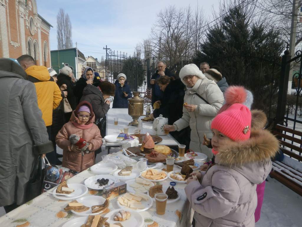 22 феваля, в Прощенное воскресение, после Чина Прощения на территории Державного храма по благословению благочинного приходов Донецкого округа иерея Владимира Татаркина состоялось мероприятие, посвященное завершению сырной недели – Масленицы.