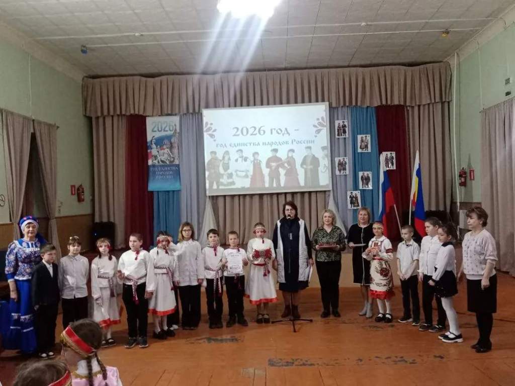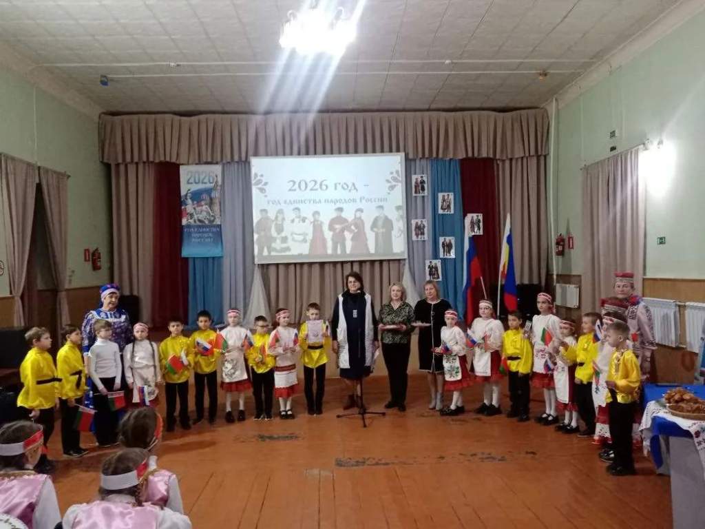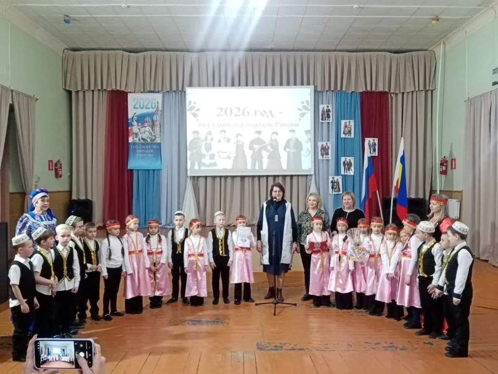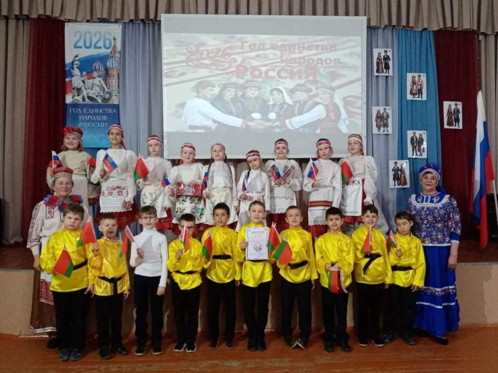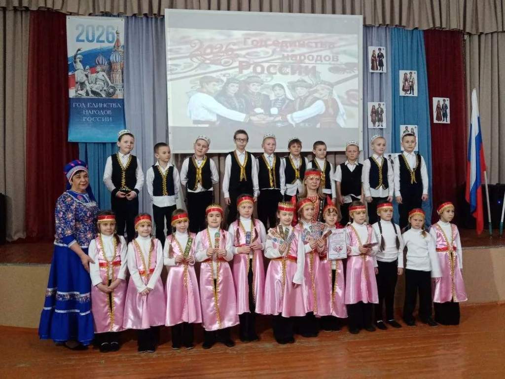 Дети начальных классов МБОУ СОШ №1, вместе с учителями выступили на сцене ДК, представив зрителям и жюри следующие национальности:1 класс учитель Тыльтина Наталья Викторовна – башкиры, 2 класс учитель Татьяна Александровна Плащевская – белорусы, 3 класс учитель Галдина Валентина Анатольевна– чуваши, 4-а класс учитель Кит Лилия Игоревна, куратор проекта Мурадян Наталья Алексеевна – казахи, 4-б класс учитель Ткачева Дарья Николаевна – якуты.