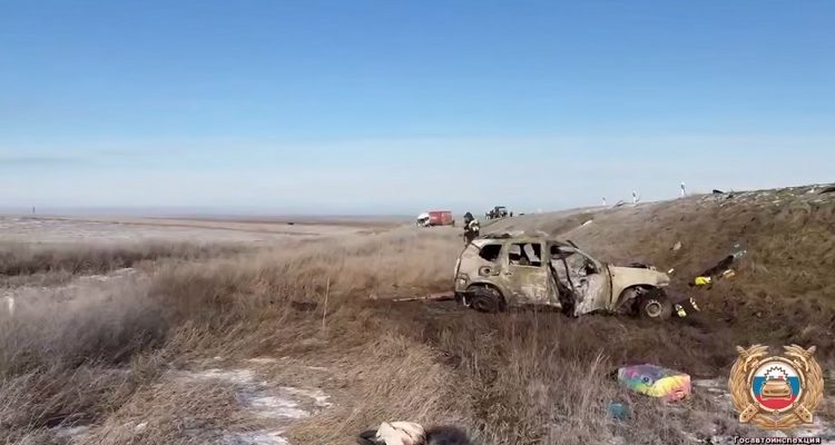 Сотрудники полиции и экстренных служб работают на месте дорожно-транспортного происшествия с возгоранием и тремя погибшими, произошедшего на трассе Элиста